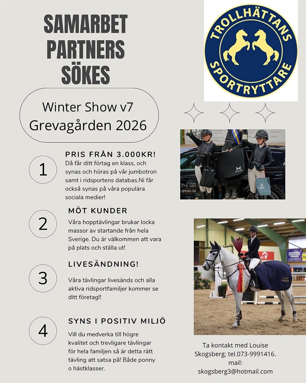 Nu gör vi propositionen till nästa års första hopptävling. Vill ditt företag synas med oss så hör av er. Vi diskuterar gärna egna upplägg, allt som gör tävlingen bättre är intressant. Sponsoransvarig Louise: +46 73-999 14 16